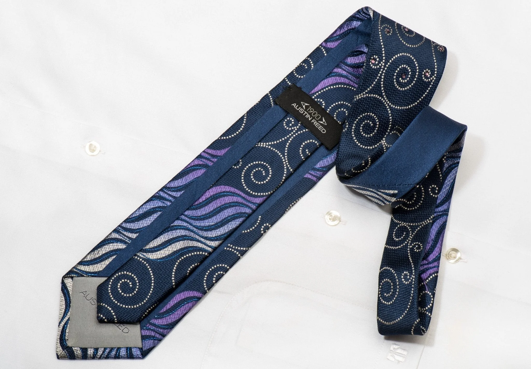 Beautiful handmade men's Rhinestone necktie handmade from the finest quality silk and designed by top brand name Austin Reed. Presenting a wonderful Waves and Scrolls design on dark blue silk, sparkling with clear crystal Rhinestones
