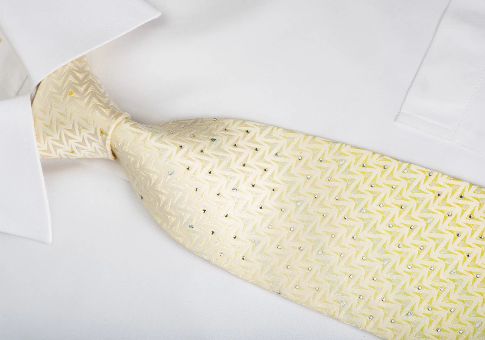 Stylish silk Rhinestone necktie perfect for any occasion handmade and designed by top brand name Austin Reed. Presenting an elegant geometric, Chevron design on graduating yellow, orange woven silk, sparkling with white Rhinestones and silver sparkles.