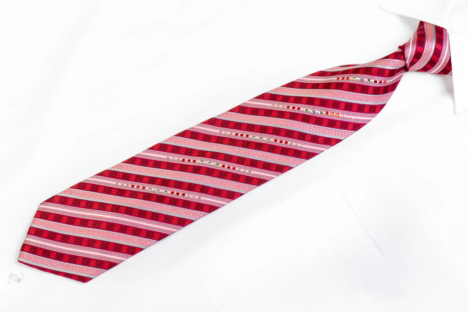 This is a stylish men's Rhinestone necktie perfect for every occasion handmade from the finest quality silk and designed by top brand name Avolio. Presenting an elegant woven Striped design on burgundy. Sparkling with Crystal Rhinestones and embellished with metallic silver sparkles.