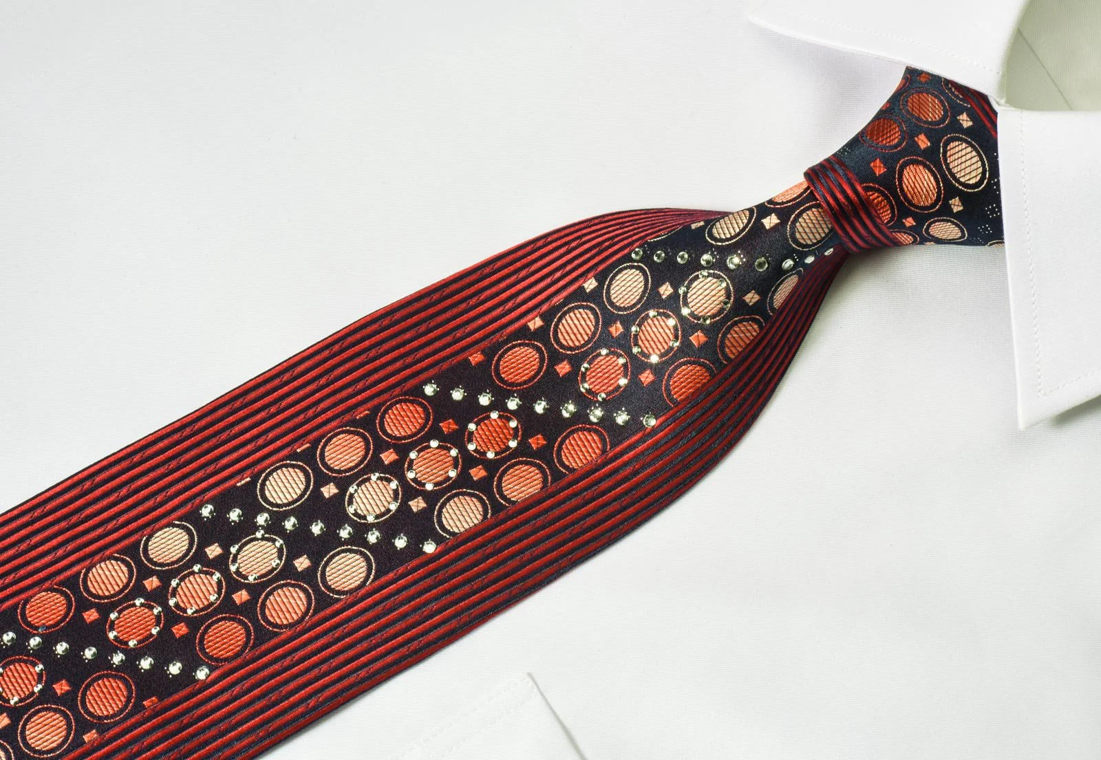 Hand made men's Rhinestone silk Necktie designed by brand name Avolio, presenting a stylish design with orange geometric circles with vertical stripes, sparkling with crystal Rhinestones and silver sparkles.