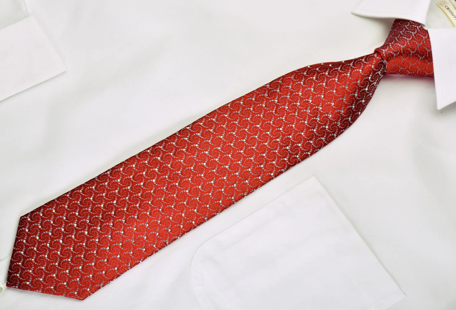Silver Geometric On Red With Silver Sparkles Rhinestone Silk Necktie