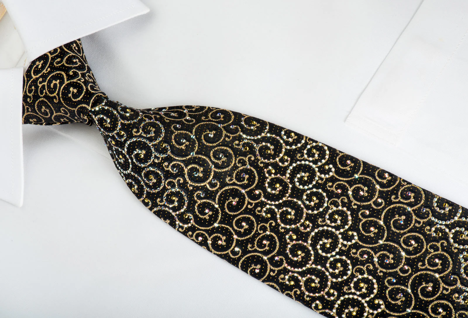 Golden Scrolls On Black Rhinestone Silk Necktie With Gold Sparkles