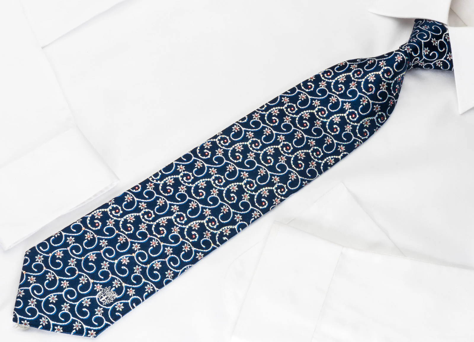Gorgeous men's woven silk Rhinestone necktie handmade from the finest quality silk and designed by top brand name Daks. Presenting a stylish Floral, Scrolls design on dark blue silk and sparkling with white, pink crystal Rhinestones and silver sparkles.