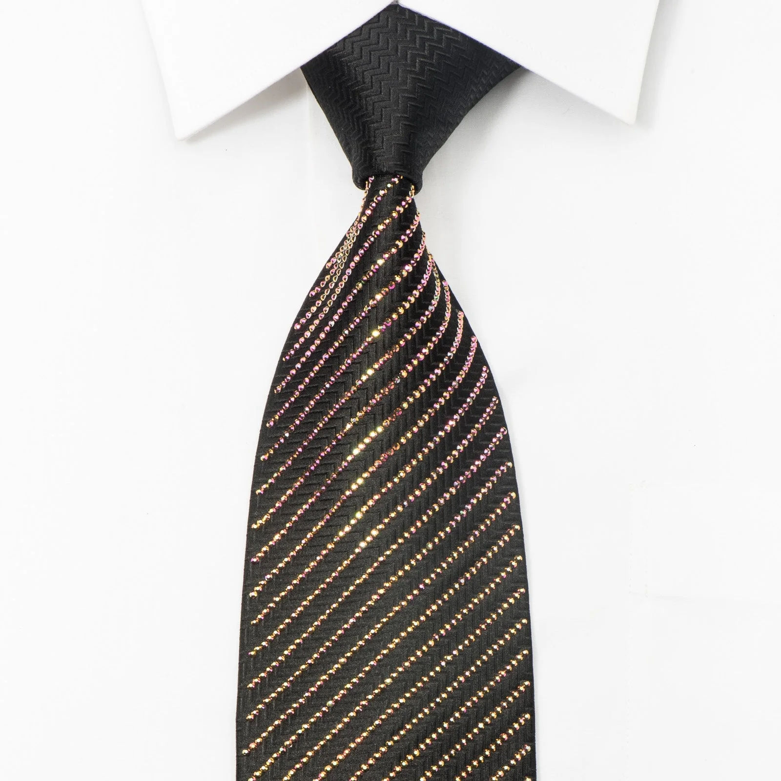 Stand out in a crowd wearing this men's bling Rhinestone silk necktie designed by Lalanta. Presenting a Stripped light show design with over 2000 golden iridescent crystal Rhinestones reflecting gold, purple and green light on woven black silk.