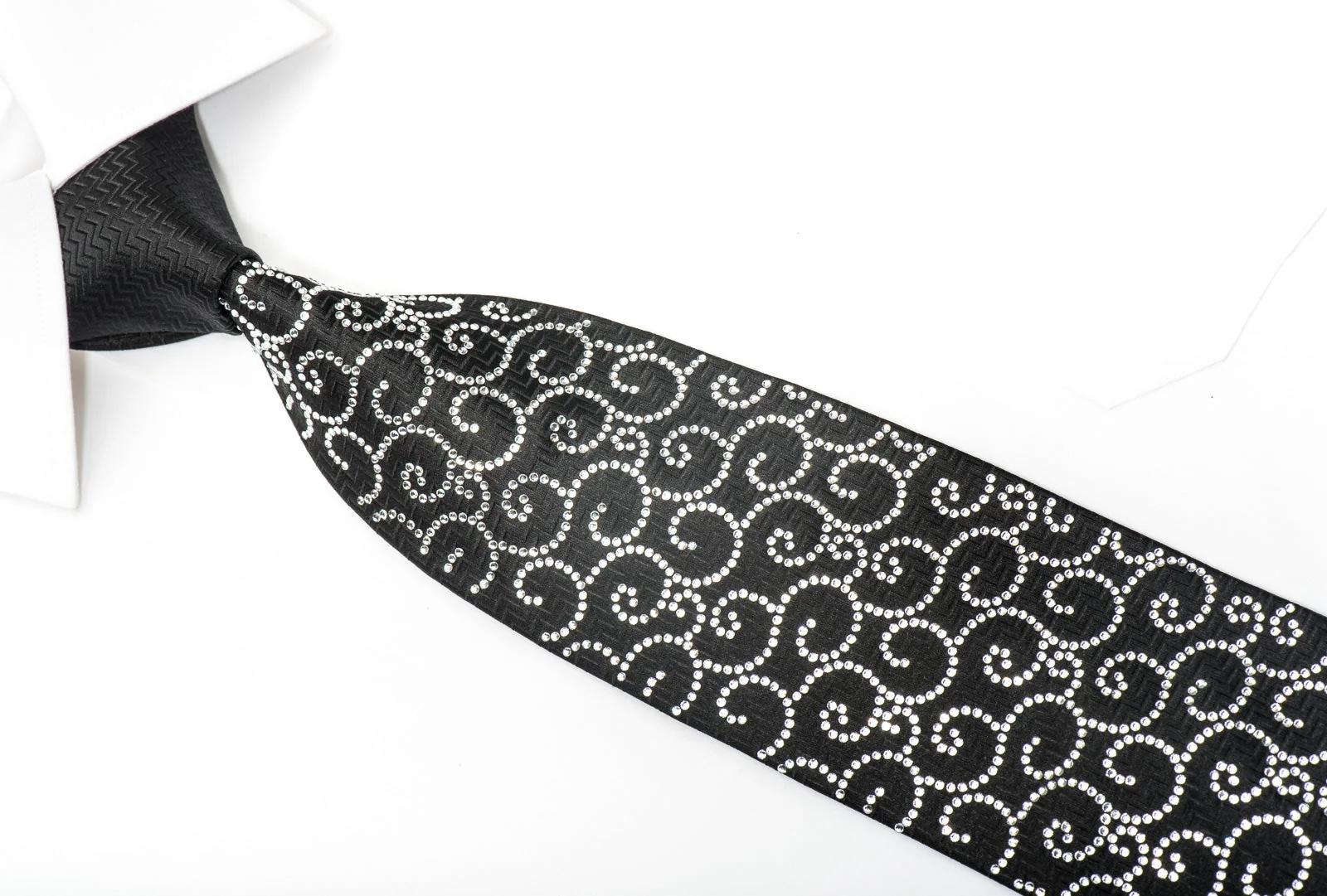 Gorgeous men's black Rhinestone necktie handmade from the finest quality silk and designed by Lalanta. Presenting an bedazzling crystal Scrolls design on black woven silk.