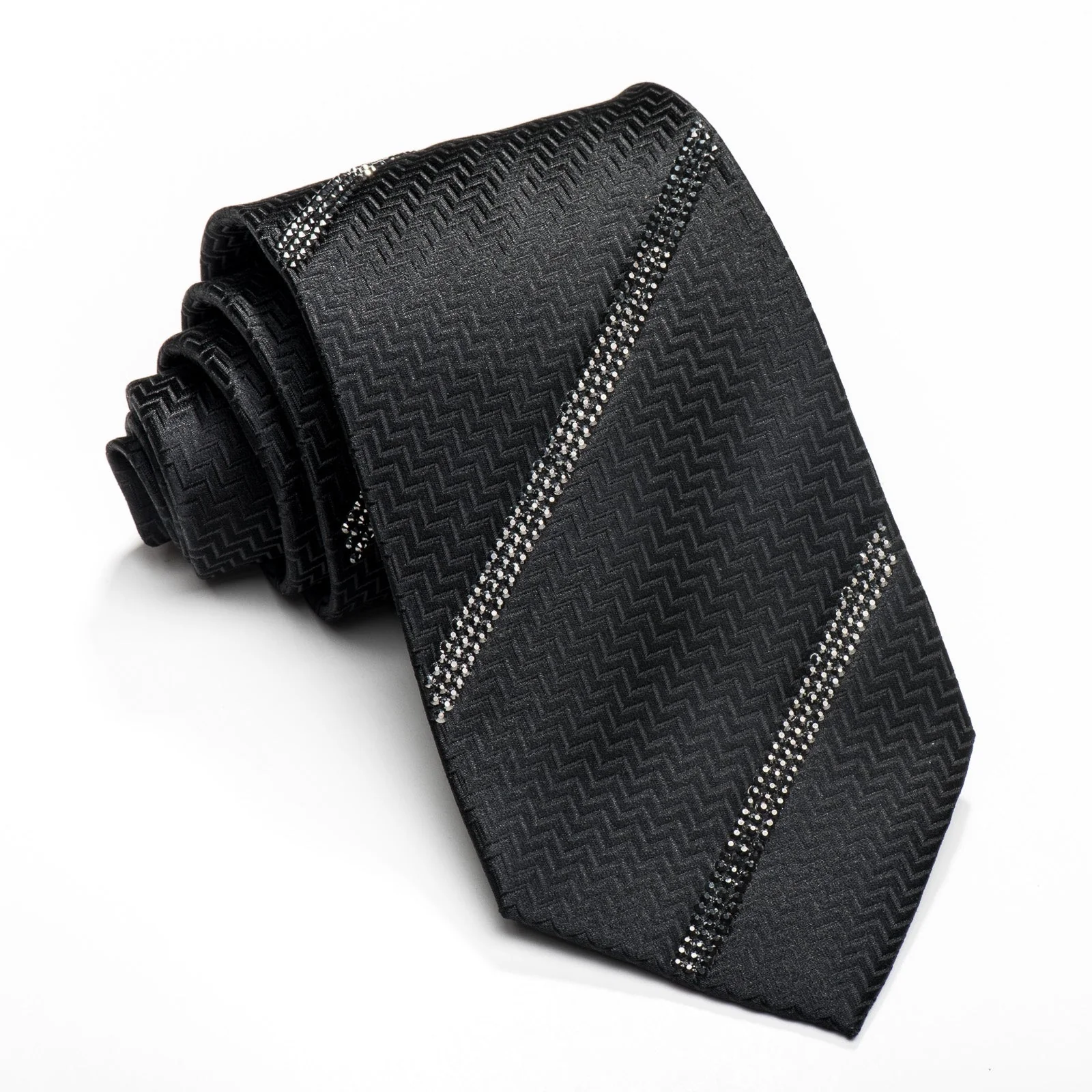 Lalanta Men's Black Silk Tie Striped Jet Black Rhinestones On Herringbone Silk