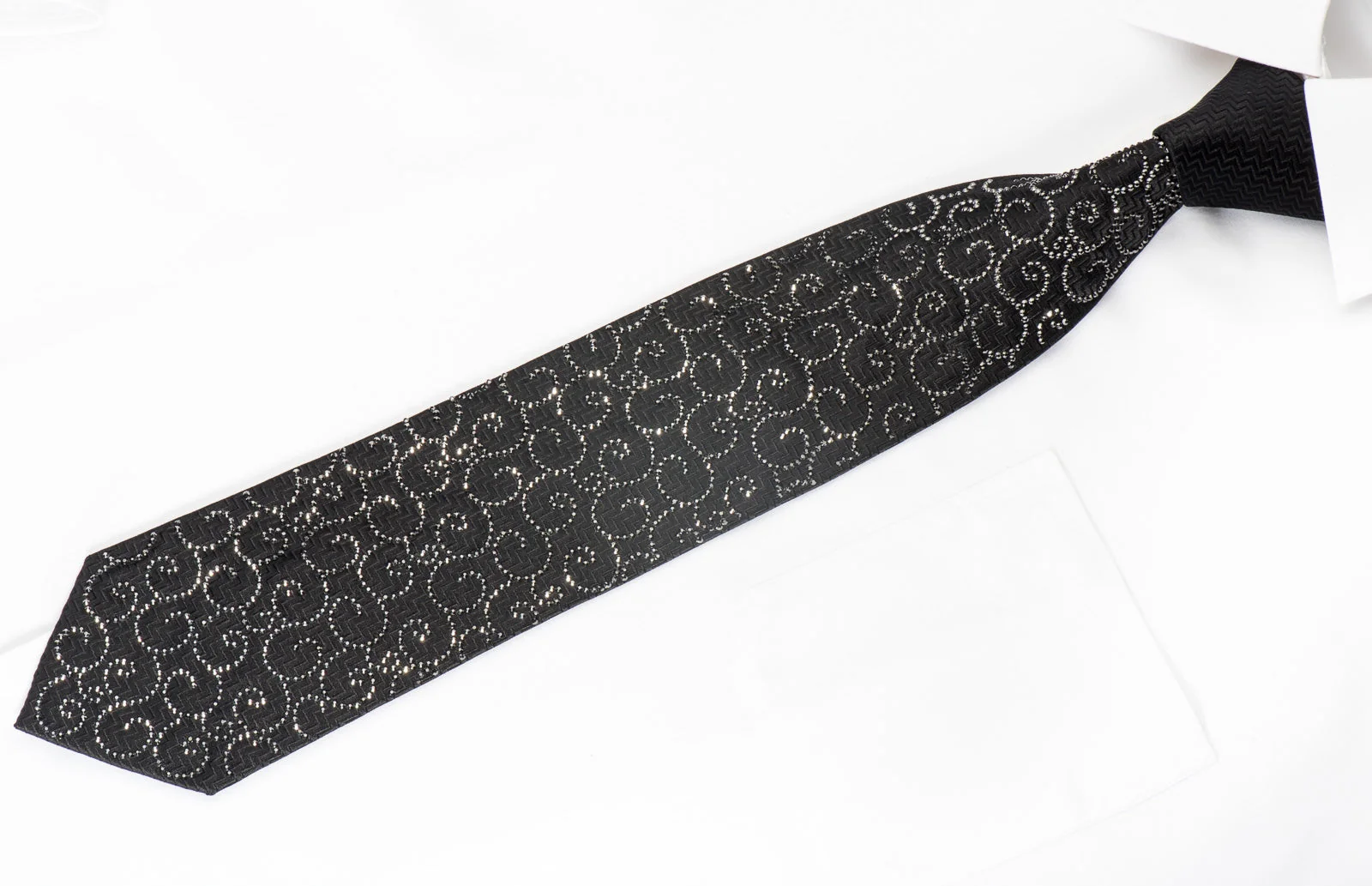 Gorgeous men's Rhinestone necktie handmade from the finest quality silk and designed by Lalatnta. Presenting a beautiful design with black Rhinestone Scrolls on black herringbone woven silk.