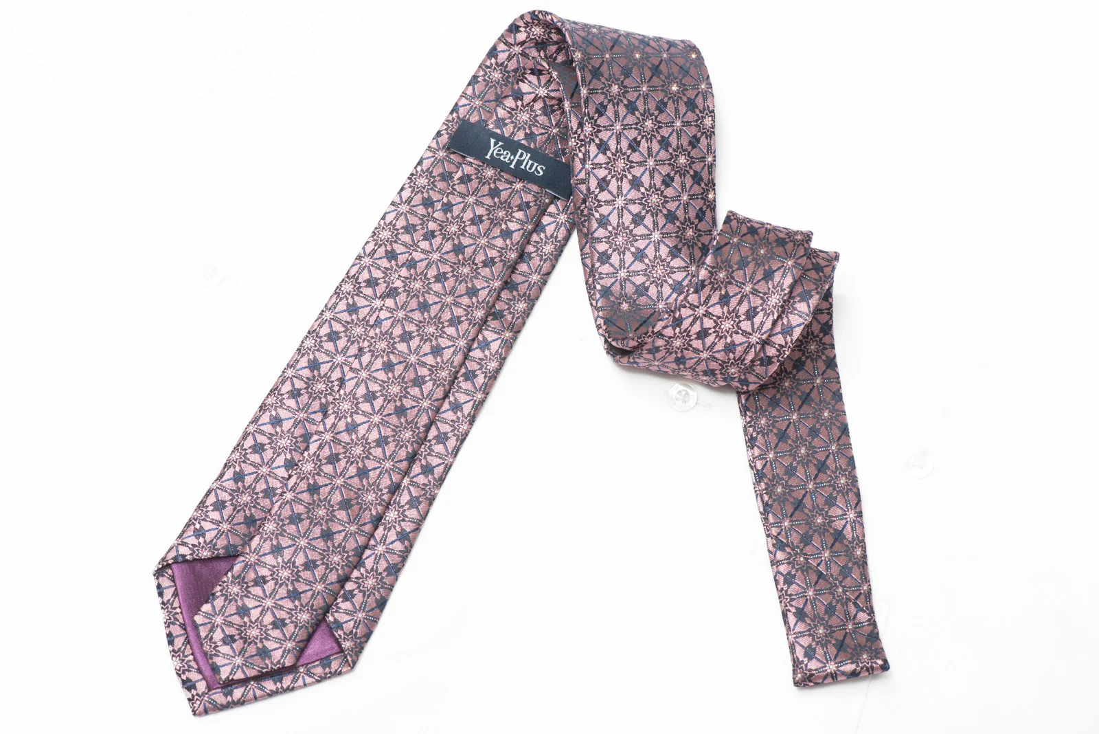 Help your outfit shine with our Mauve Geometric Silk Necktie, adorned with Navy Blue Rhinestones and Silver Sparkles. Perfect for adding a touch of elegance to any look.
