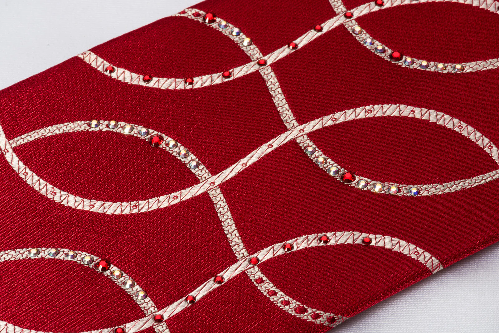 Stand out in crowd wearing this gorgeous handmade men's woven silk Rhinestone necktie designed by top brand name Nina Ricci, presenting a stylish design with silver ribbons or waves on beautiful burgundy silk and sparkling with clear white, red crystal Rhinestones.