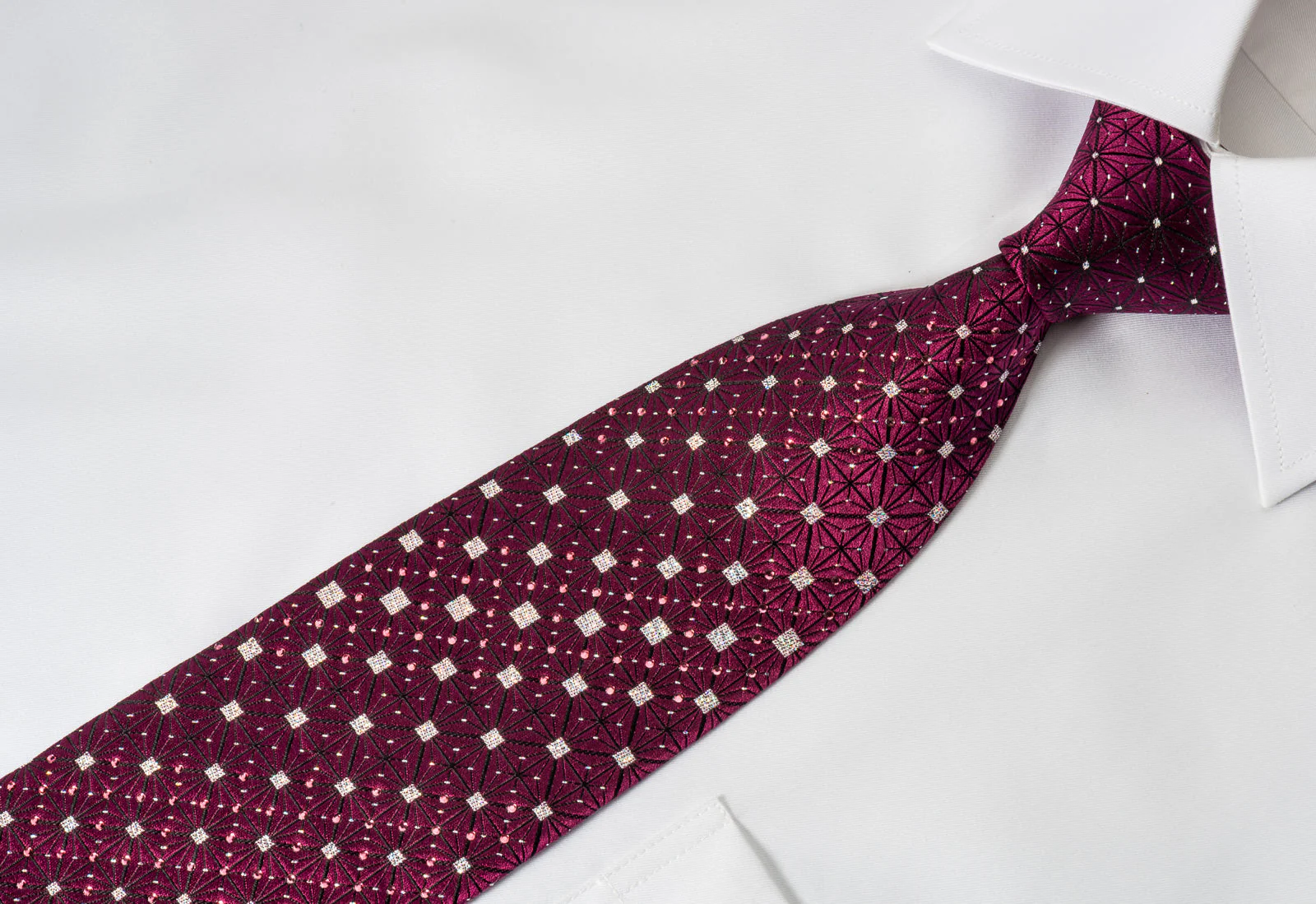 This is a gorgeous handmade men's woven silk Rhinestone necktie designed by top brand name Park Land, presenting an elegant geometric Trellis design on purple silk and sparkling with clear purple crystal Rhinestones and metallic silver sparkles.
