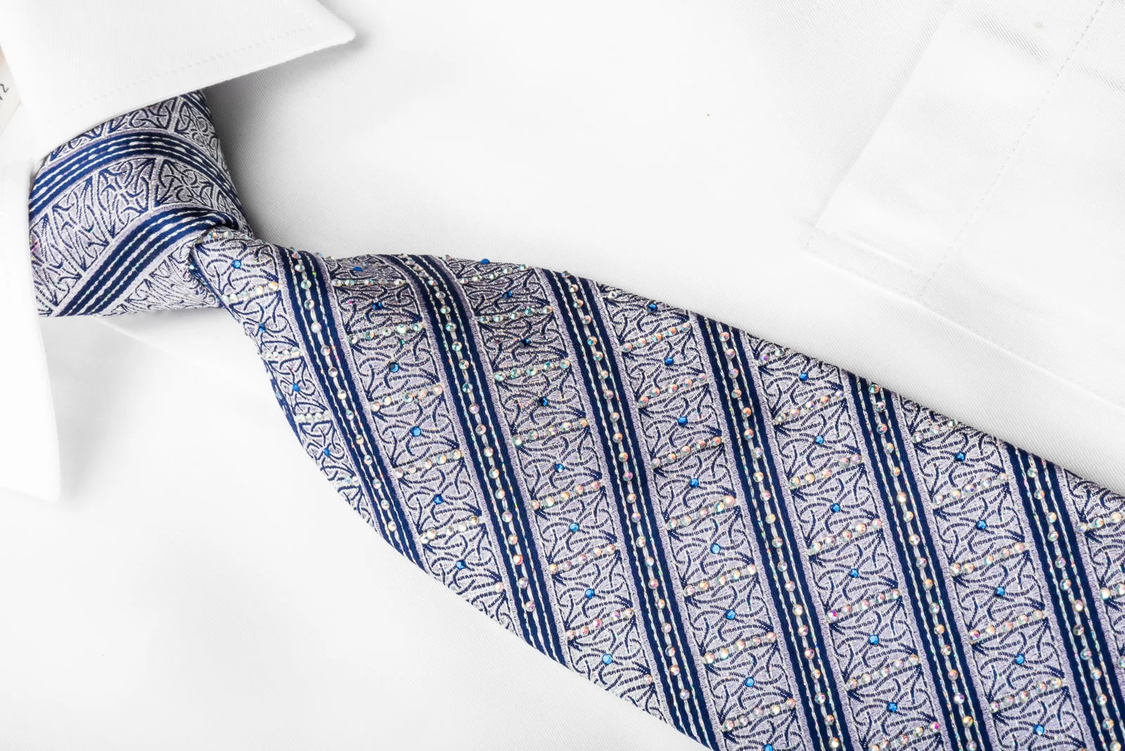 This Rhinestone Silk Necktie is carefully handcrafted using top-quality materials. Its eye-catching design features blue stripes on a silver background, accented with white and blue Rhinestones and sparkling silver. We are certain it will capture your attention.
