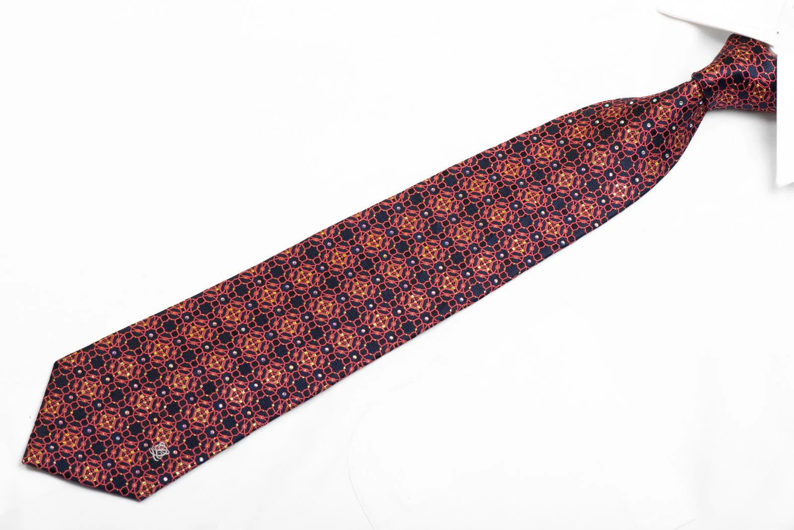 Rhinestone Silk Necktie Pink Interlocking On Navy Blue With Gold Sparkles