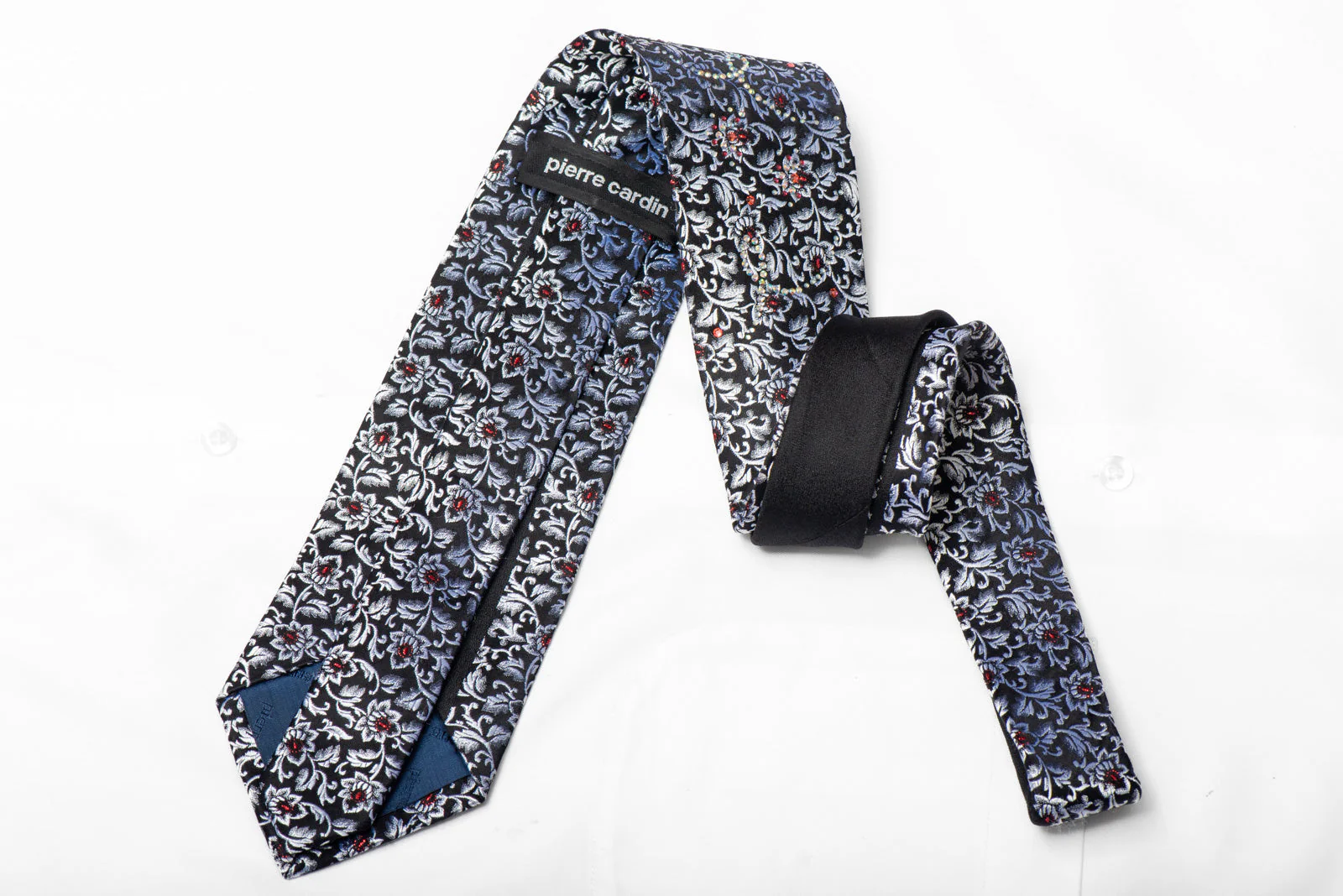 This Silver Floral On Black Rhinestone Silk Tie With Red Sparkles will add a touch of elegance to your outfit.