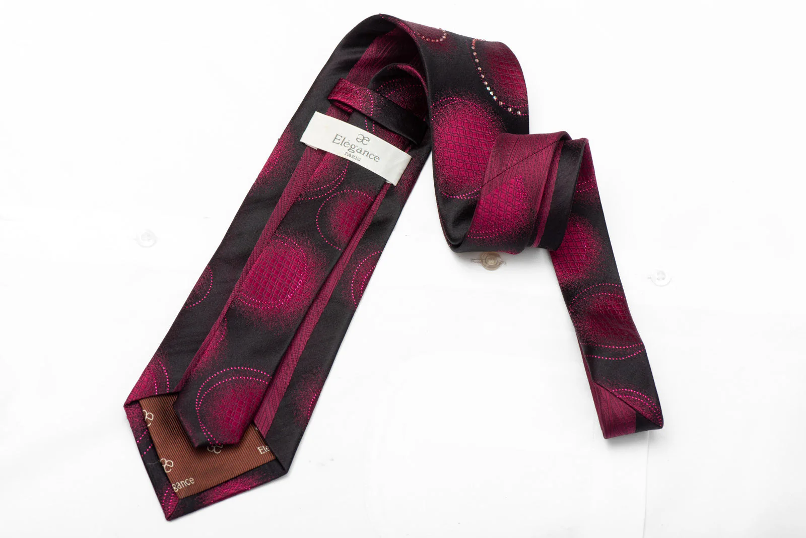Elevate your formal wardrobe with this striking silk tie featuring a captivating violet geometric pattern set against a sophisticated black background. Adorned with shimmering rhinestones and sparkles, this accessory brings an elegant touch of glamour to any occasion. The luxurious silk construction ensures a refined drape and comfortable wear, making it perfect for weddings, galas, or upscale events where you want to make a memorable impression.